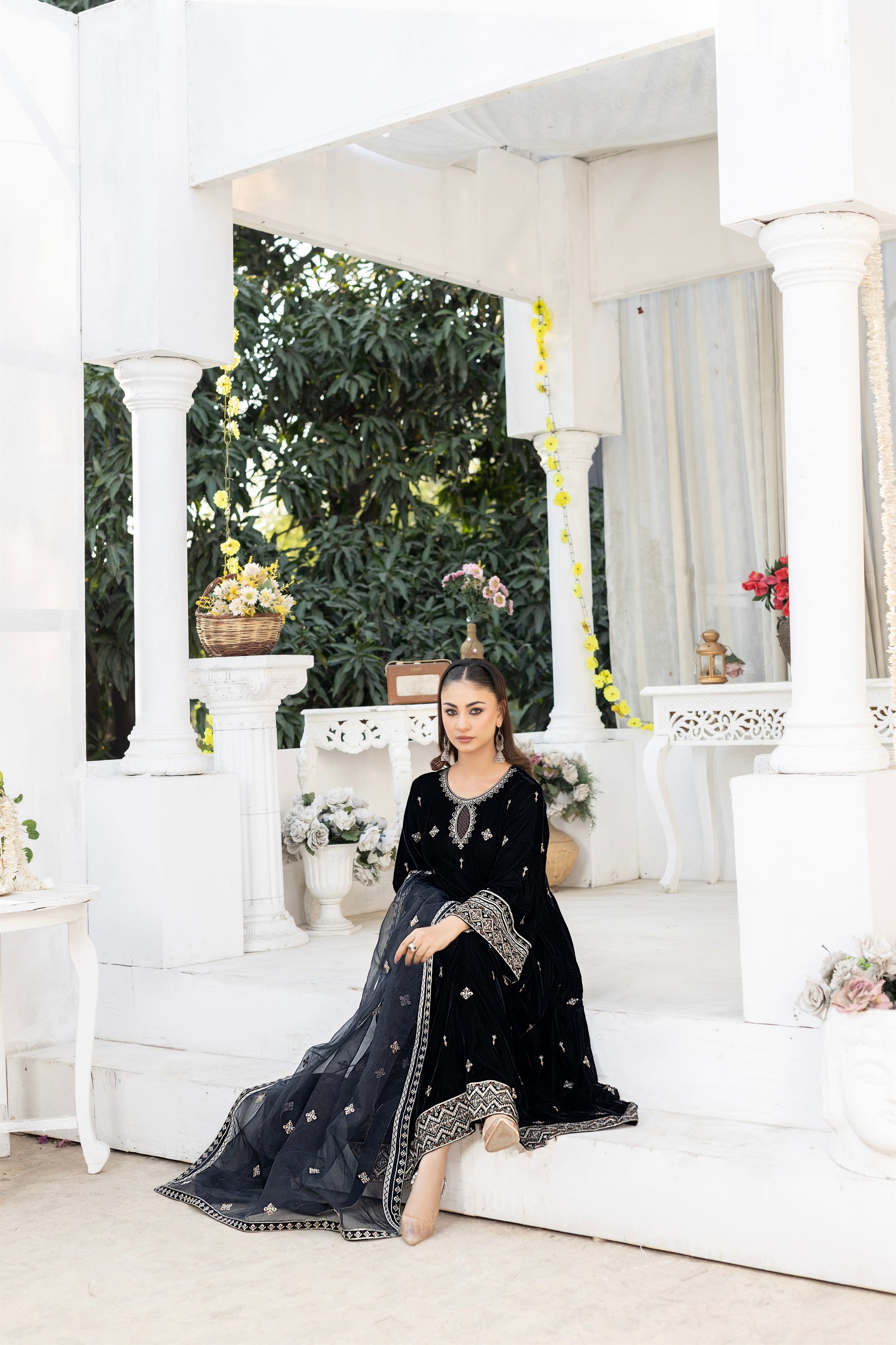 This stunning black velvet box frock seamlessly blends heritage with contemporary flair. Adorned with intricate geometric and floral embroidery, it features heavily embroidered sleeves, daman, and border, accentuated with resham and brown thread detailing. Paired with a breathtaking embroidered organza dupatta, complete with 4-side border and scattered floral motifs, this ensemble embodies elegance with a fusion twist.