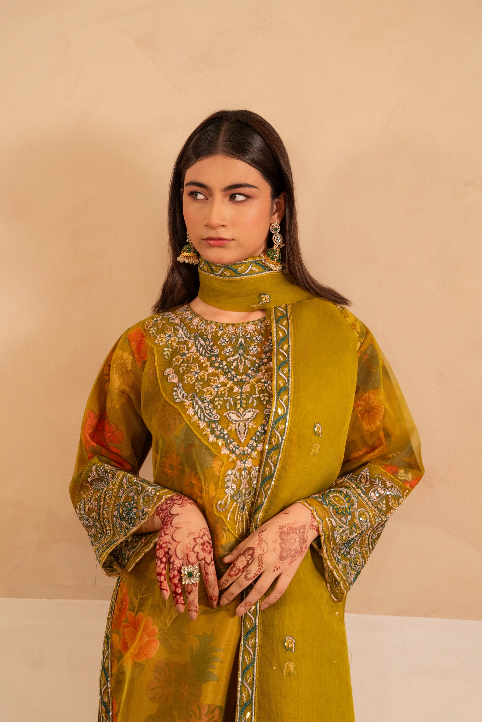 This stunning three-piece embroidered dress features an intricately embroidered organza dupatta, a beautifully crafted shirt with multi-thread embroidered neckline, sleeves, and chalks. Minimal hand embellishments add a touch of sophistication. Paired with loose flapper pants for a chic look.