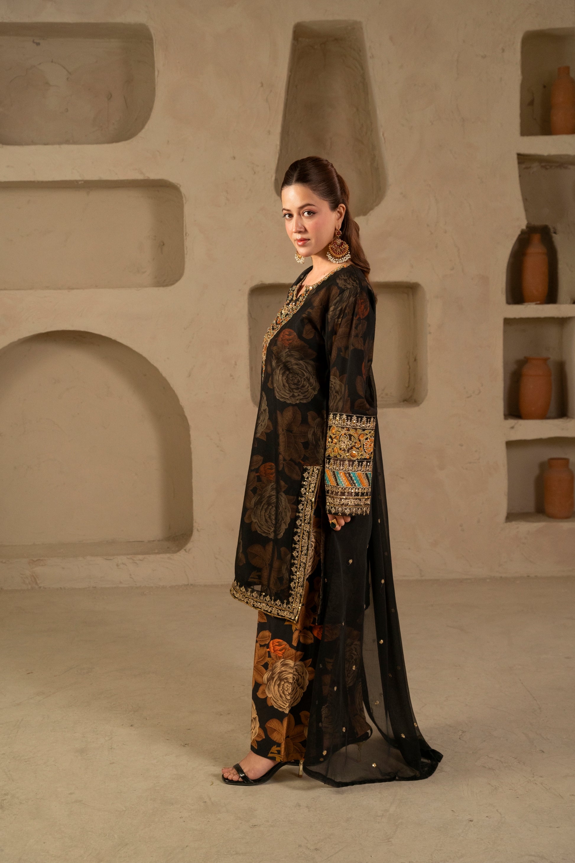 A timeless expression of grace —this long chiffon embroidered shirt paired with printed crepe lining and flared bottoms exudes effortless charm. The delicate embroidery, highlighted with multicolored threads, adds a touch of festive radiance. Completed with an embroidered chiffon dupatta for that perfect, sophisticated finish.