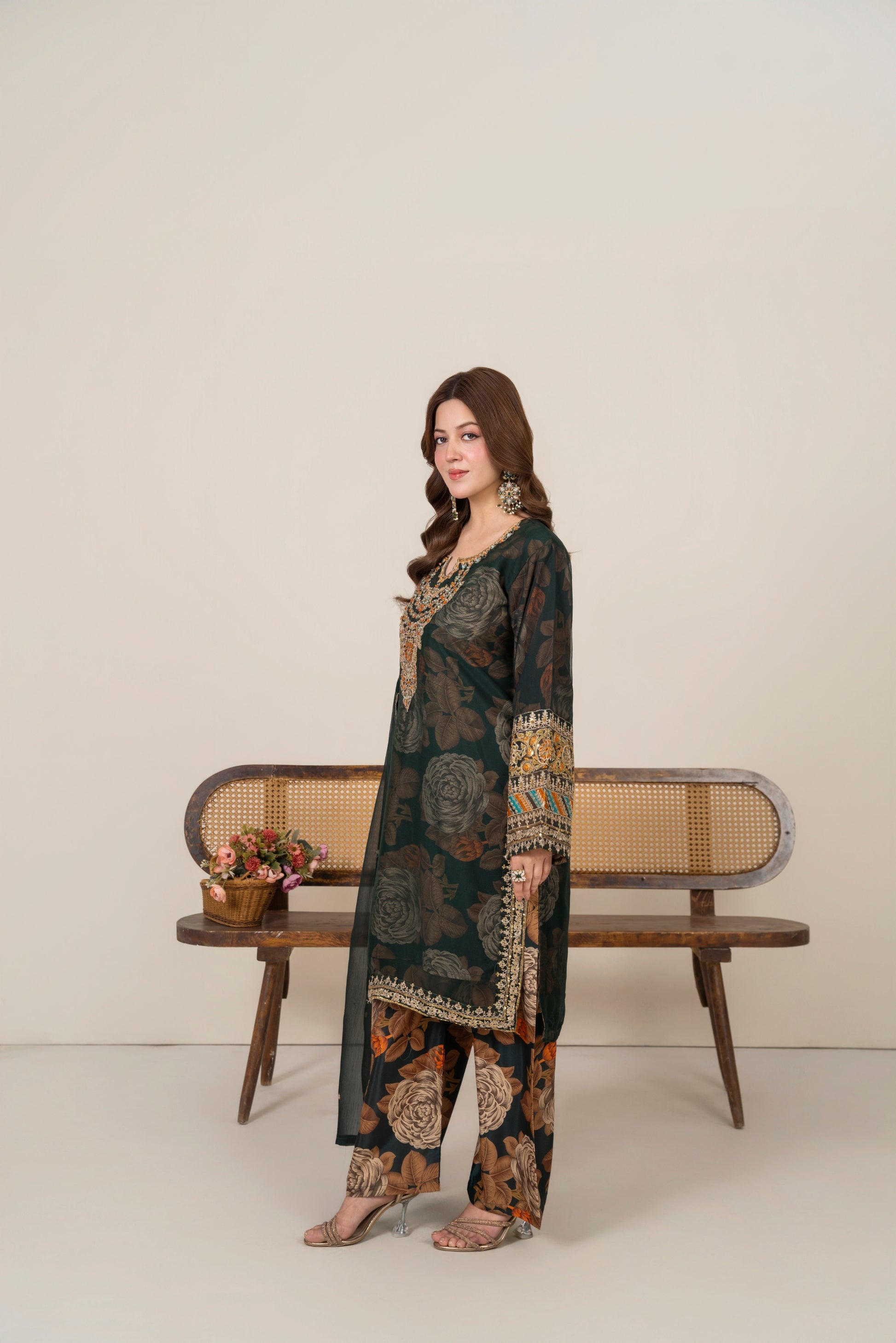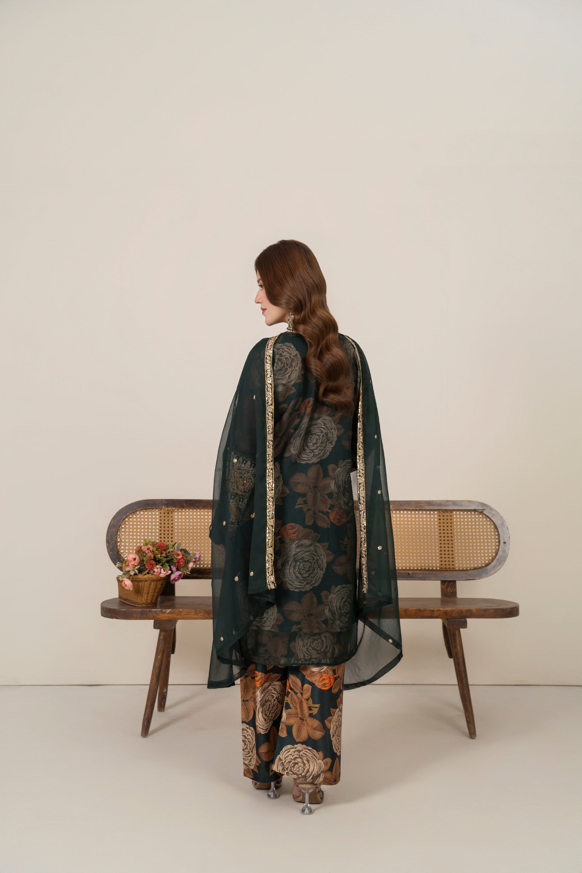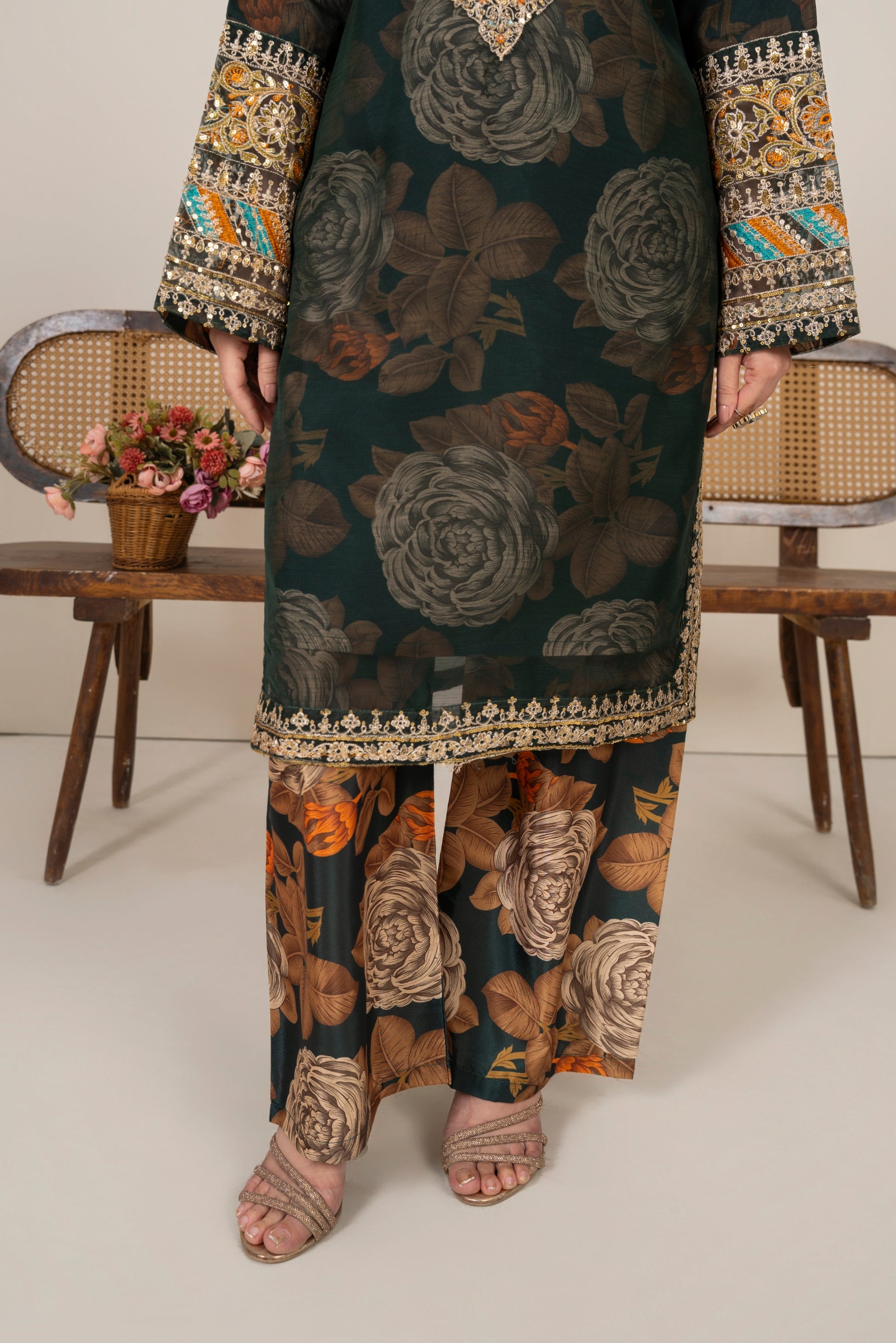A timeless expression of grace —this long chiffon embroidered shirt paired with printed crepe lining and flared bottoms exudes effortless charm. The delicate embroidery, highlighted with multicolored threads, adds a touch of festive radiance. Completed with an embroidered chiffon dupatta for that perfect, sophisticated finish.
