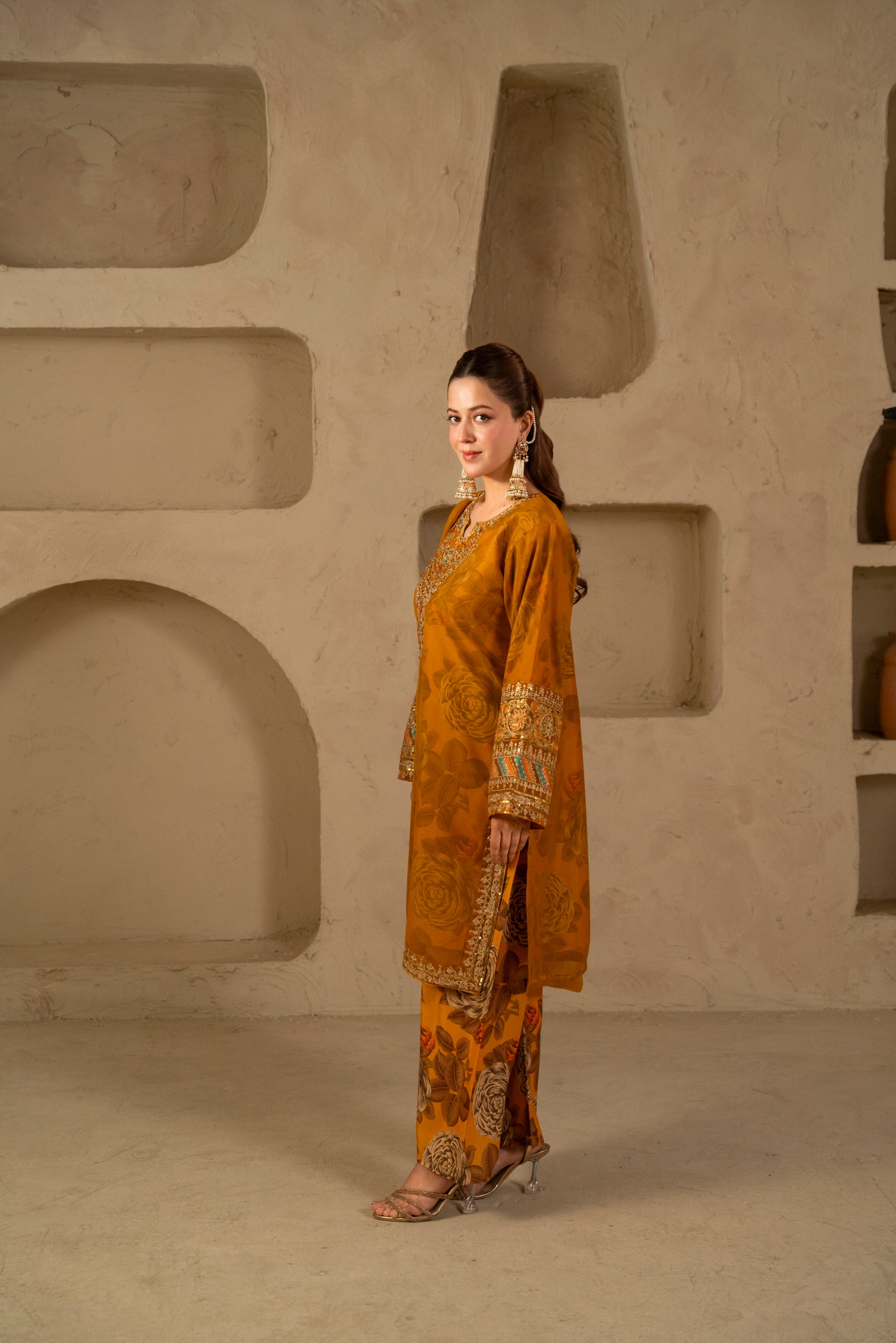 A timeless expression of grace —this long chiffon embroidered shirt paired with printed crepe lining and flared bottoms exudes effortless charm. The delicate embroidery, highlighted with multicolored threads, adds a touch of festive radiance. Completed with an embroidered chiffon dupatta for that perfect, sophisticated finish.