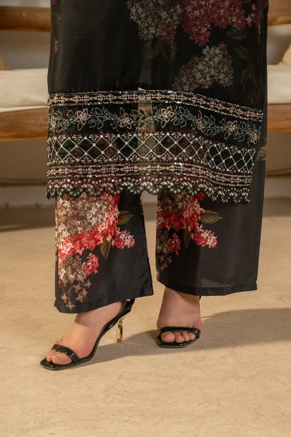 Stunning chiffon dress with multi-thread embroidered shirt featuring minimal hand embellishments. Paired with a beautifully embroidered multi-thread dupatta and floral printed crepe trousers. Elegance at its finest!