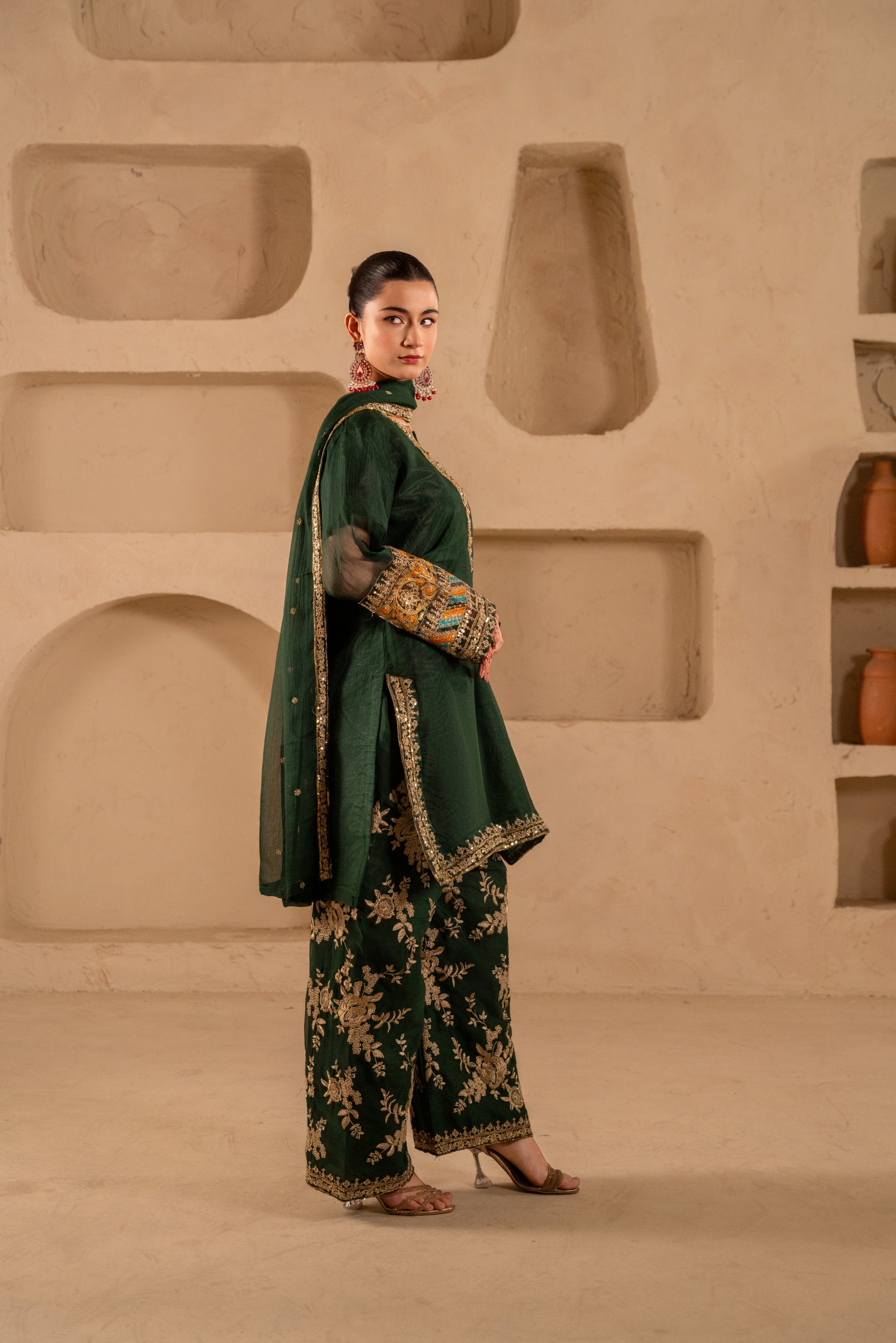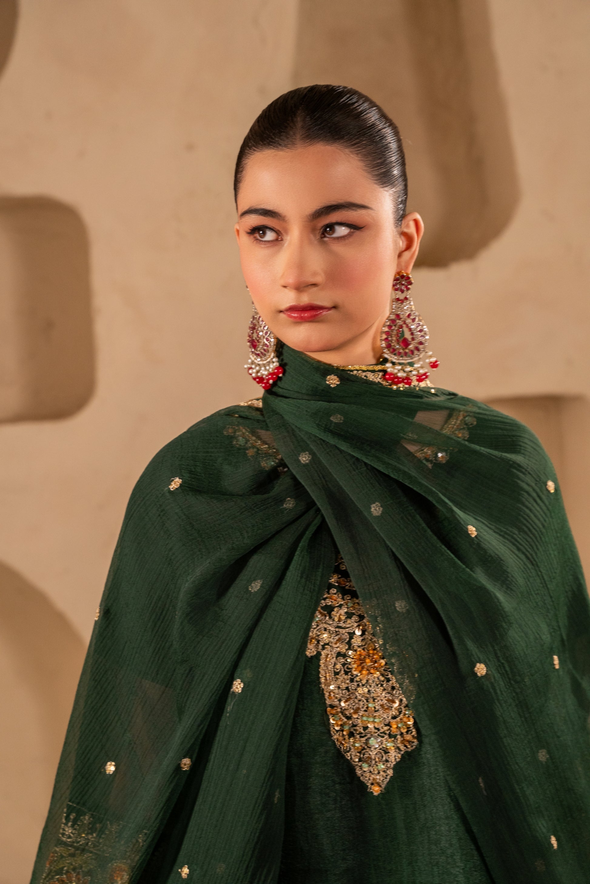 This stunning embroidered three-piece chiffon dress comes with an embroidered shirt, dupatta, and heavily embroidered flat-bottom gharara pants. Looks so pretty & chic and gives festive regal vibes!