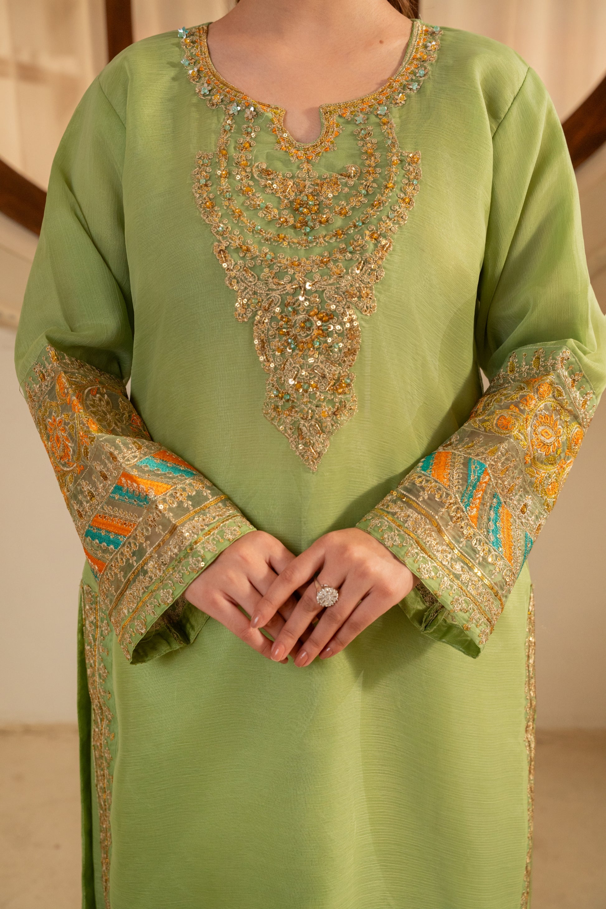 This stunning embroidered three-piece chiffon dress comes with an embroidered shirt, dupatta, and heavily embroidered flat-bottom gharara pants. Looks so pretty & chic and gives festive regal vibes!